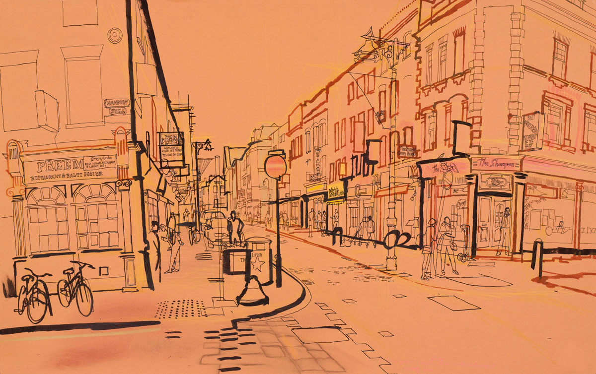 lucinda rogers drawing ink watercolour london life street scene city brick lane spitalfields bicycle