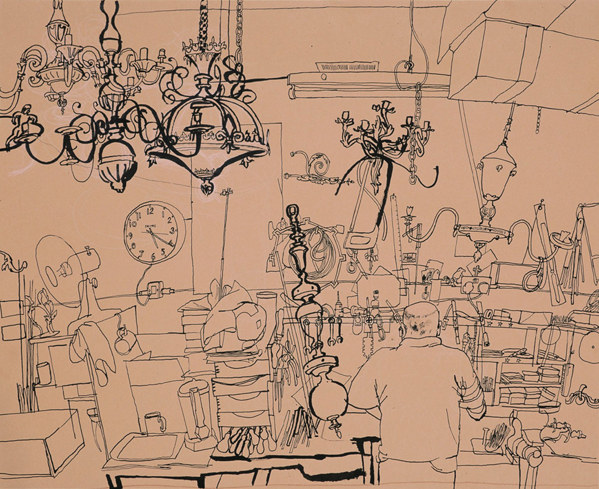 lucinda rogers drawing ink berwick street soho london light chandelier workshop city life