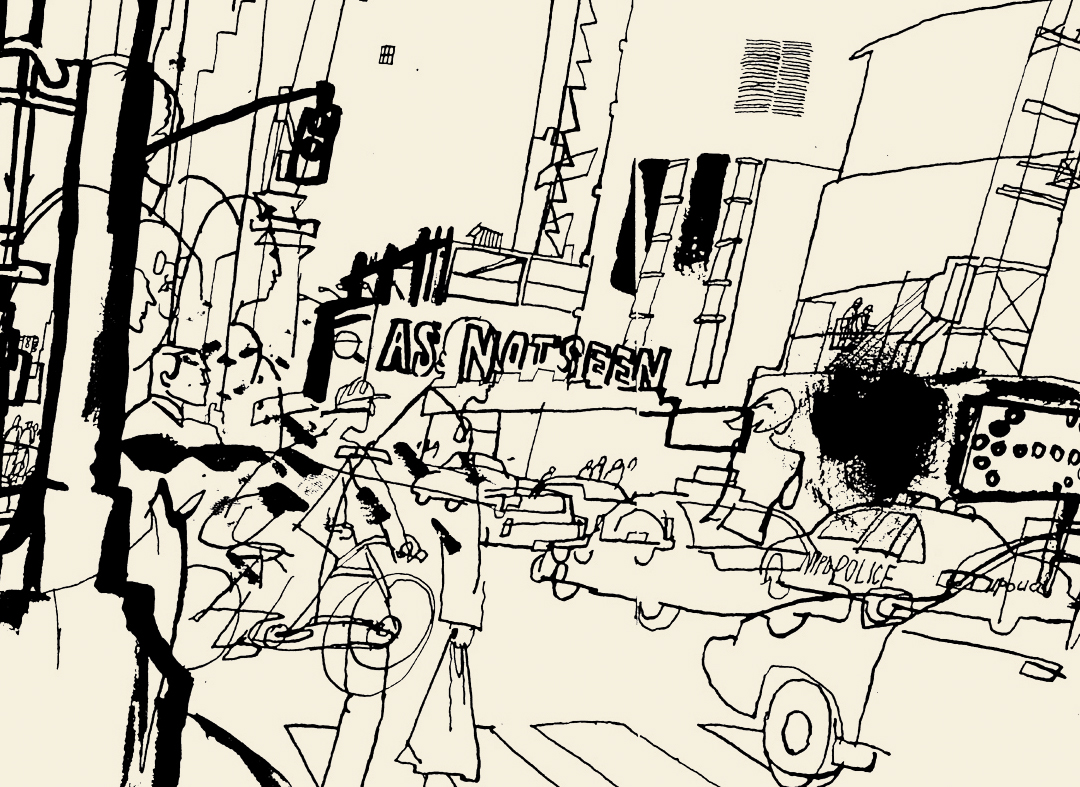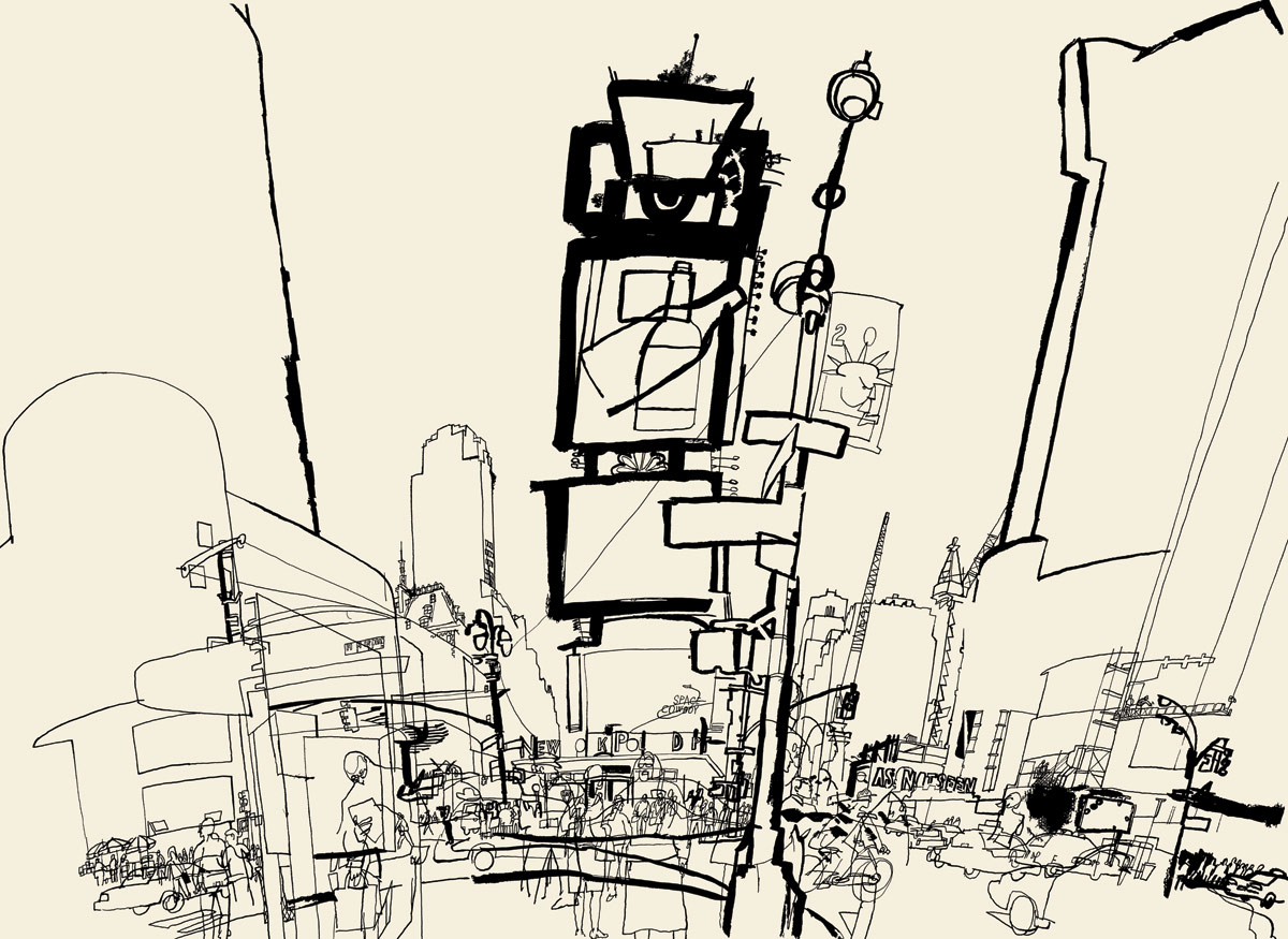 lucinda rogers ink line drawing Times Square new york cityscape street scene traffic