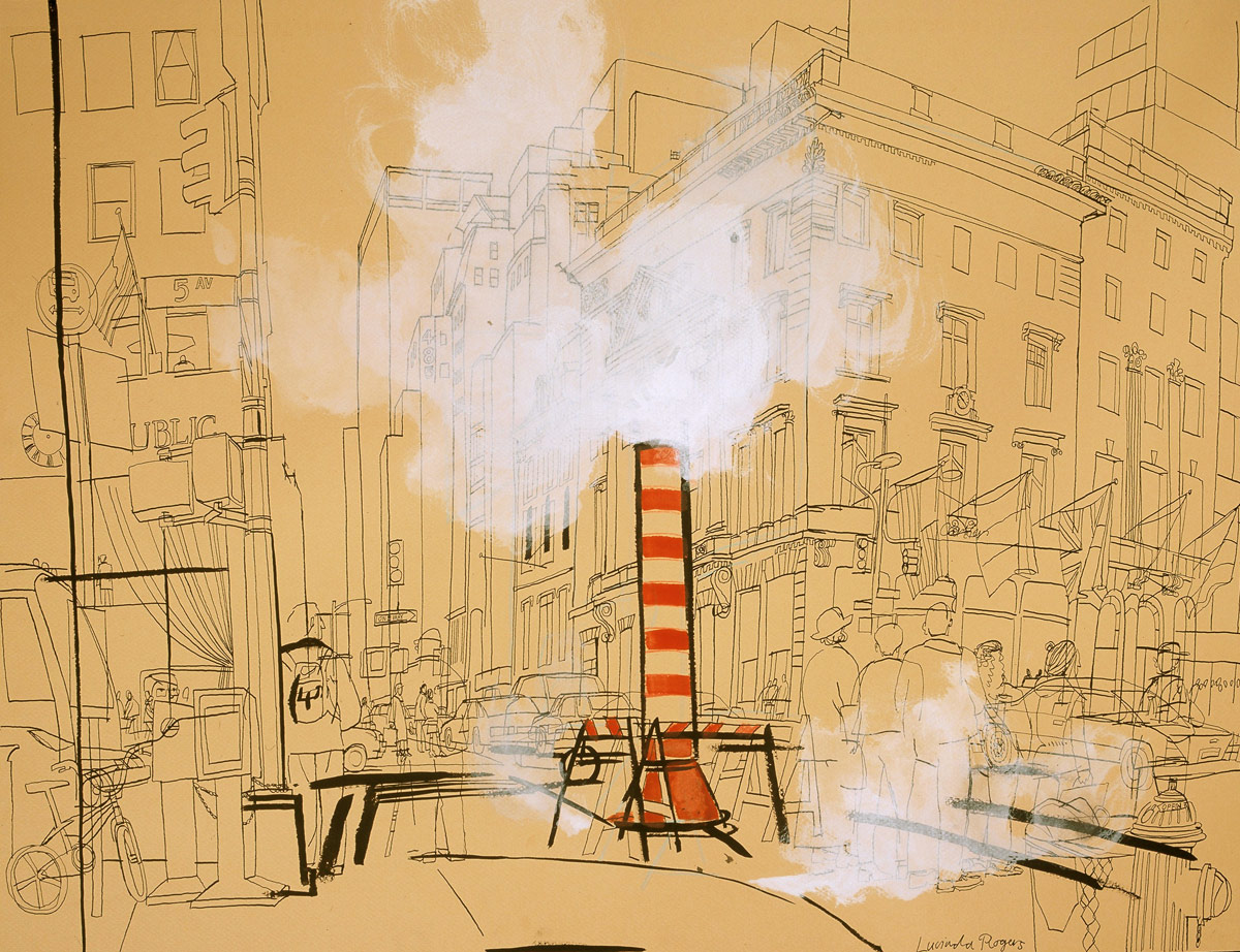 lucinda rogers drawing ink black and white red steam fifth avenue new york city street scene